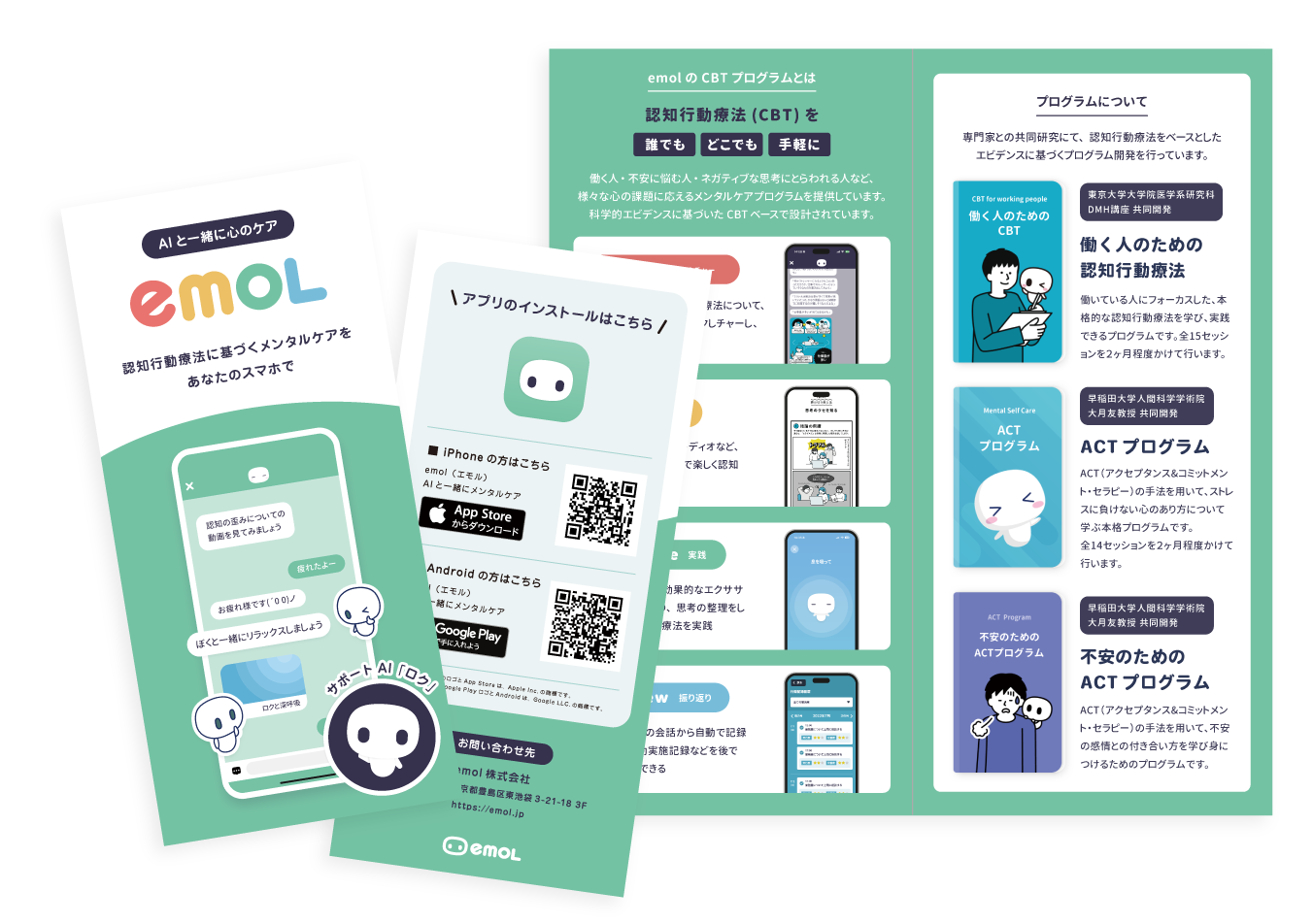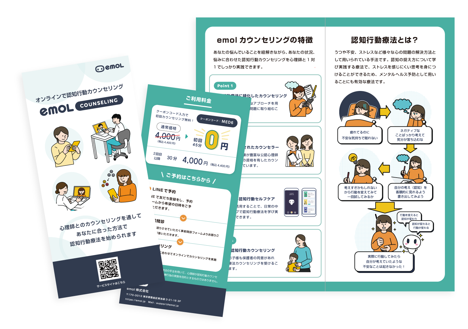 emolの医療関連サービスをまとめた案内ページです。オンラインCBT『emolカウンセリング』と疾患啓発アプリ『フアシル』の患者様向けリーフレットを、ご家族や担当医の推薦時などに活用いただける形でご用意しました。サービス特徴、利用方法などを掲載し、ダウンロード即日入手または無料郵送を承りますのでお気軽にお申し込みください。治療継続を支える資料としてぜひご利用ください。